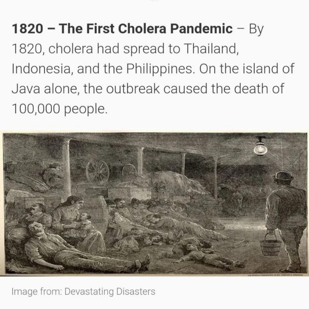 Pada 200 tahun lepas iaitu 1820, wabak pandemik kolera pertama telah menula hingga ratusan ribu yang mati akibat wabak tersebut. Ia bermula dari bandar Kolkata, India dan tersebar meluas ke Asia Tenggara seperti Filipina, Thailand, Indonesia dan terus menular ke Timur Tengah, Afrika Timur dan pantai Mediterranean.