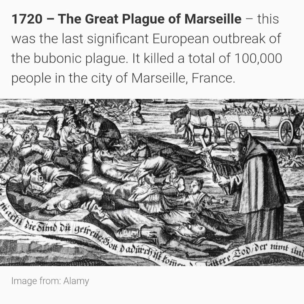 Pada tahun 1720, 300 tahun sebelum ini, wabak penyakit terbesar Marseille telah melanda Eropah sehingga membunuh 100,000 orang di bandar Marseille, Perancis. Ia merupakan wabak bubonic (bengkak-bengkak) terakhir yang melanda Eropah. Wabak ini berpunca daripada bakteria Yersenia Pestis berasal dari haiwan kecil seperti tikus.