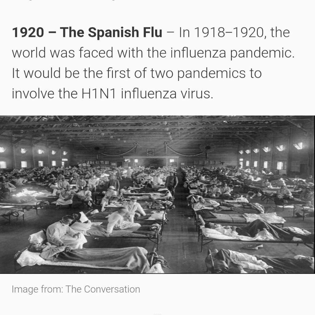 Pada 100 tahun lepas iaitu 1920, berlaku pula wabak pandemik influenza atau lebih dikenali dengan nama The Spanish Flu. Ia merupakana antara dua wabak pandemik pertama berkaitan influenza termasuklah virus Influenza H1N1. Wabak ini telah dijangkiti lebih 500 juta penduduk seluruh dunia dan hampir 3% ke 5% populasi penduduk dunia mati disebabkan pandemik tersebut.
